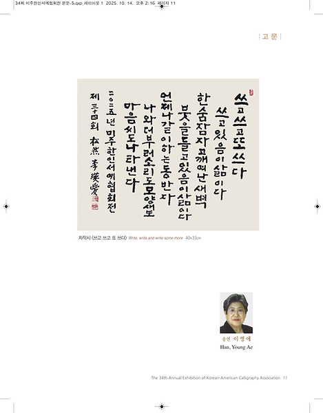 미주한인서예협회가 주최하는 제34회 정기전이 오는 11월 20일(목)부터 12월 5일(금)까지 LA한국문화원 2층 아트갤러리에서 열립니다.